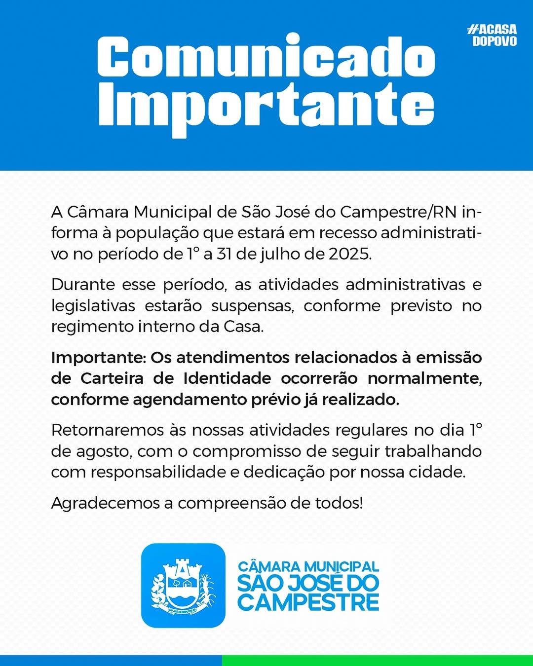 A Câmara Municipal de São José do Campestre/RN informa à população que estará em recesso administrativo no período de 1º a 31 de julho de 2025.
